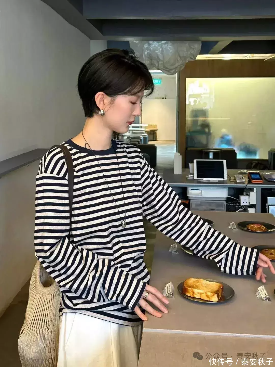 若你的性格较为内敛温柔,身材又比较纤细,建议你选这种细细窄窄的条纹衫来穿。